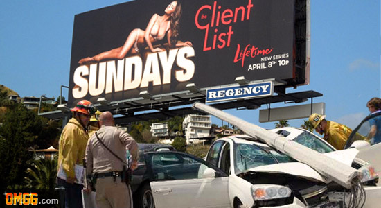 Cleavage-heavy billboards advertising the actress’ new show, The Client List, have been popping up (and out) all over Southern California, making it nearly impossible for drivers to keep their eyes on the road.