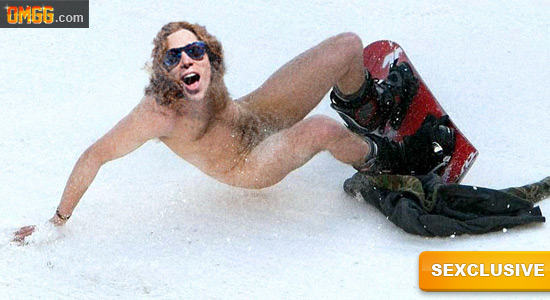 One of the pics show the pale, gangly, freckle-faced redhead having sex with an attractive blonde woman, the other shows him snowboarding in the buff.